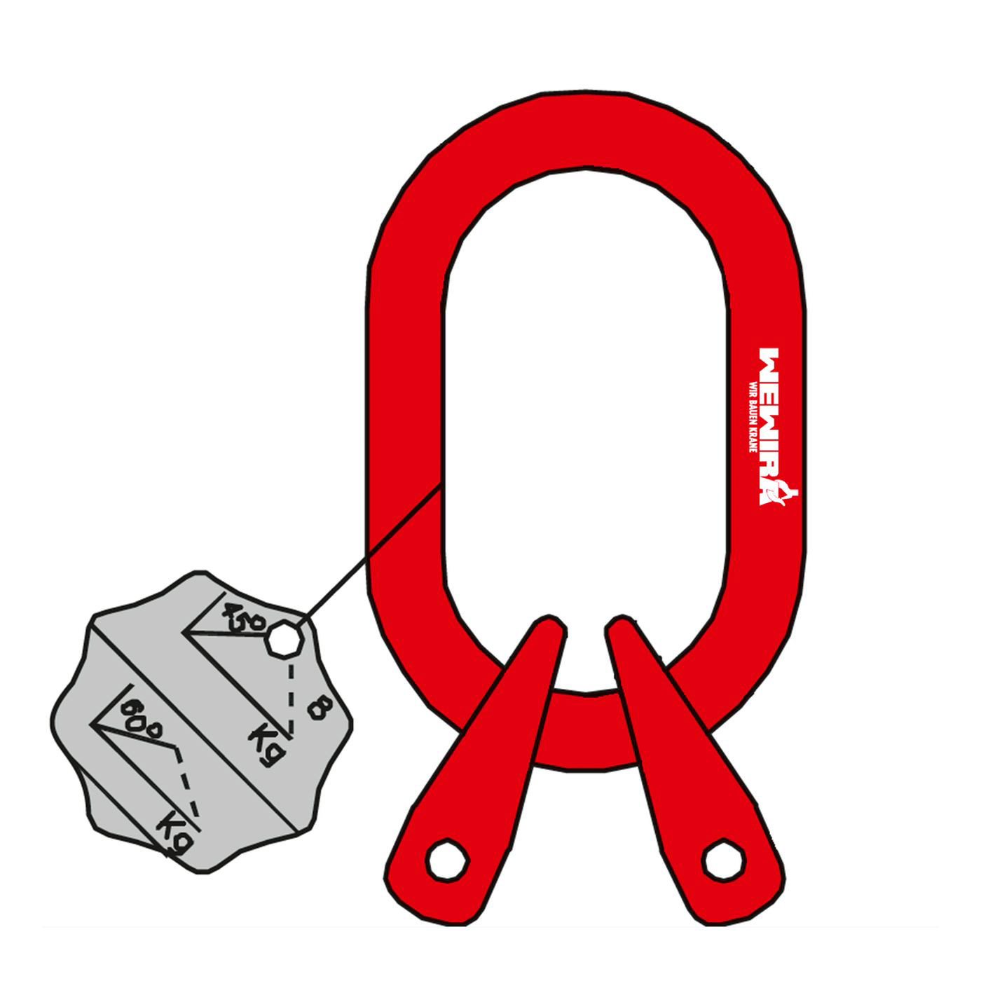 Aufhängekopf DIN 5688-3 Typ A 2 mit 2 eingearbeiteten SIKA Kettenverbindern Typ KV und Tragfähigkeitsanhänger für 2-strang Kettengehänge nach EN 818-4 rot lackiert.