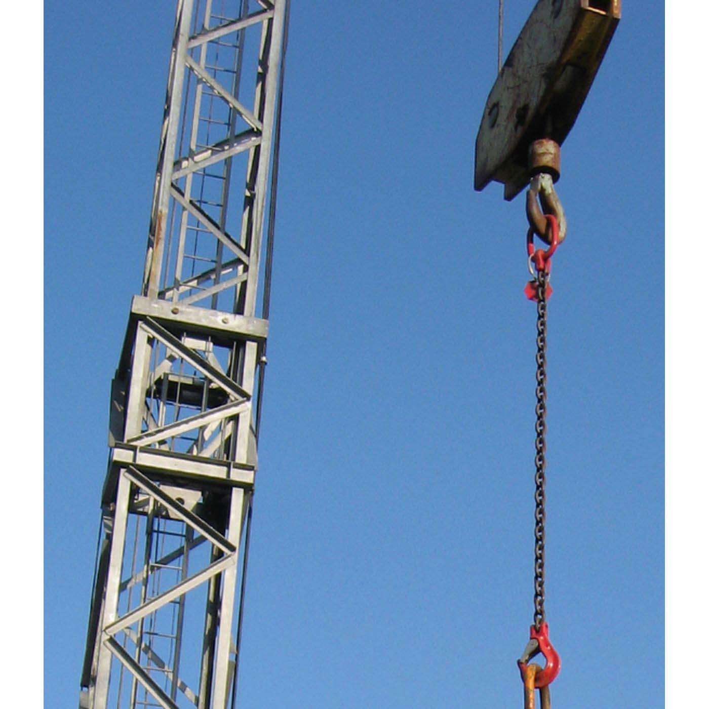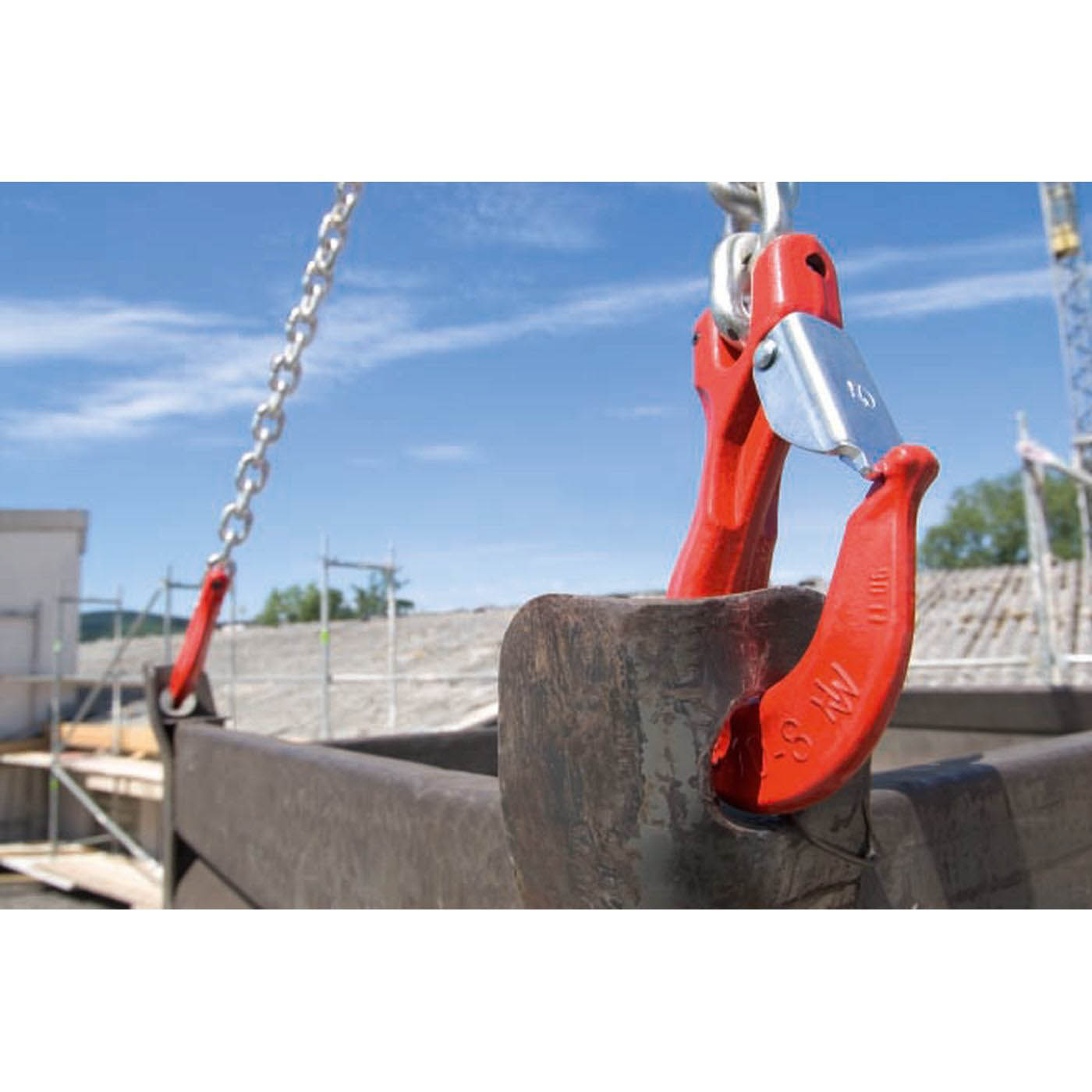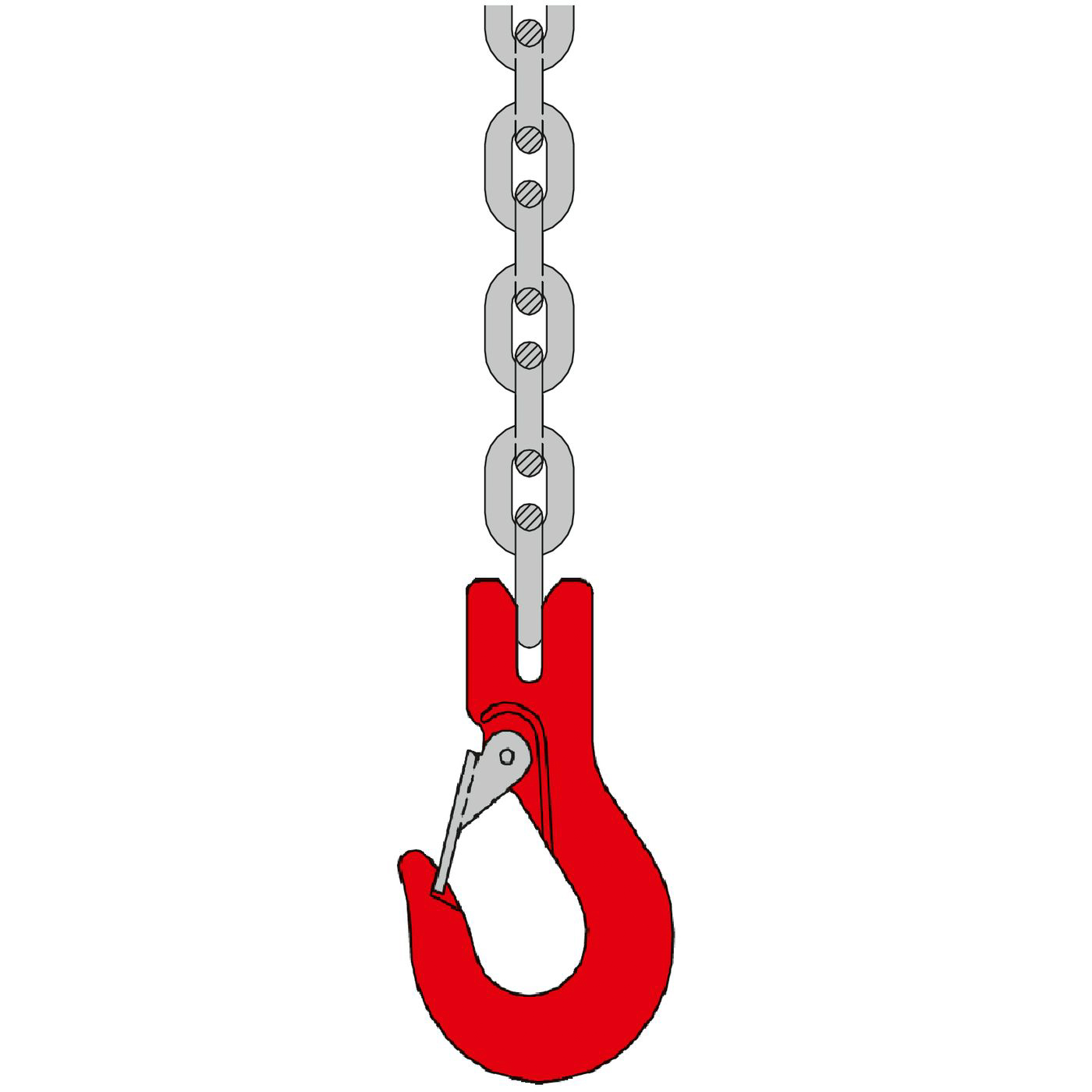 Das Kettengehänge der Güteklasse 8 ist mit einem Gabelkopfhaken Typ SGCS mit stabiler Blechsicherung. Beschlag und Haken sind rot lackiert, Blechsicherung verzinkt.