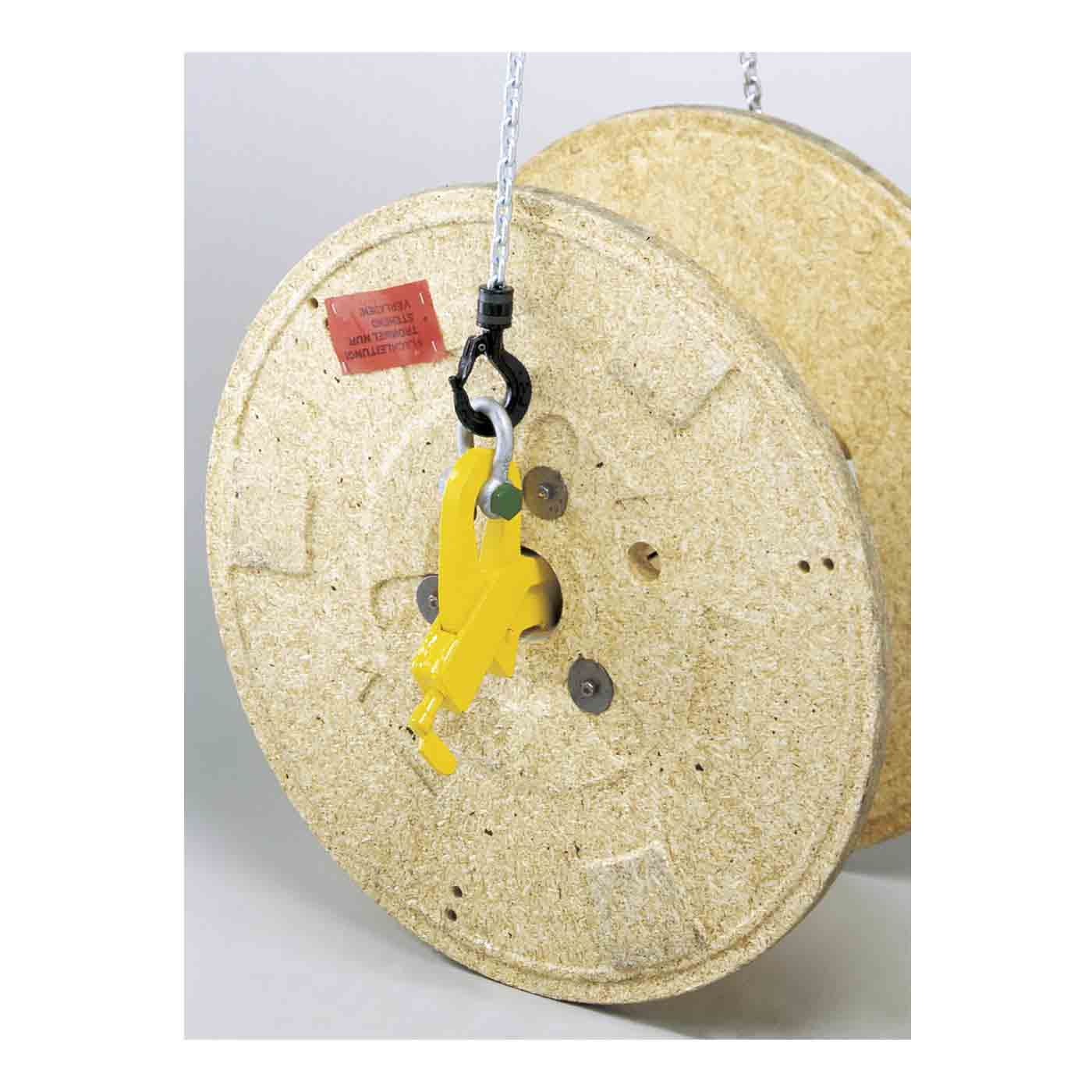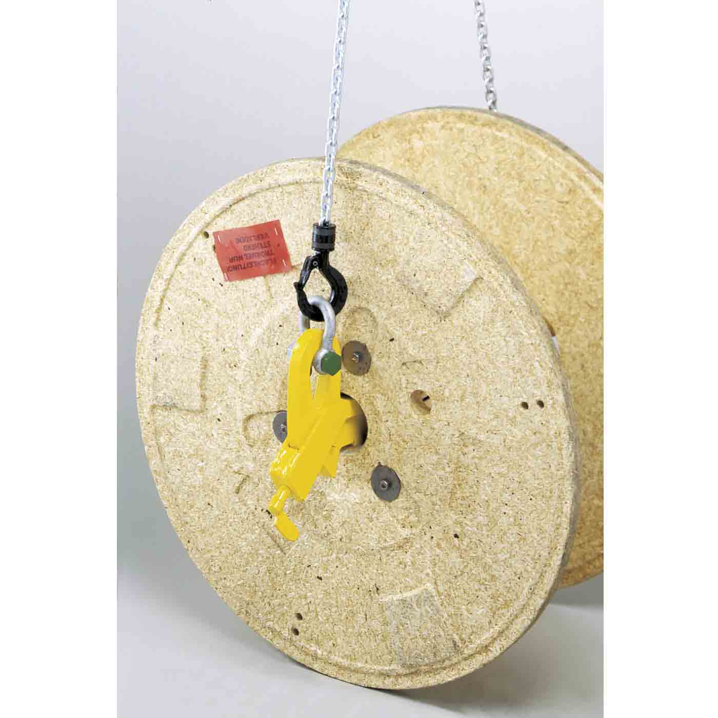 Die speziell für den Transport von Kabeltrommeln entwickelten Klemmen werden paarweise eingesetzt. Durch Spreizen der Klemme erfolgt eine Verriegelung in der Trommel. Über einen Sicherungshebel können die positionierten Klemmen arretiert werden.