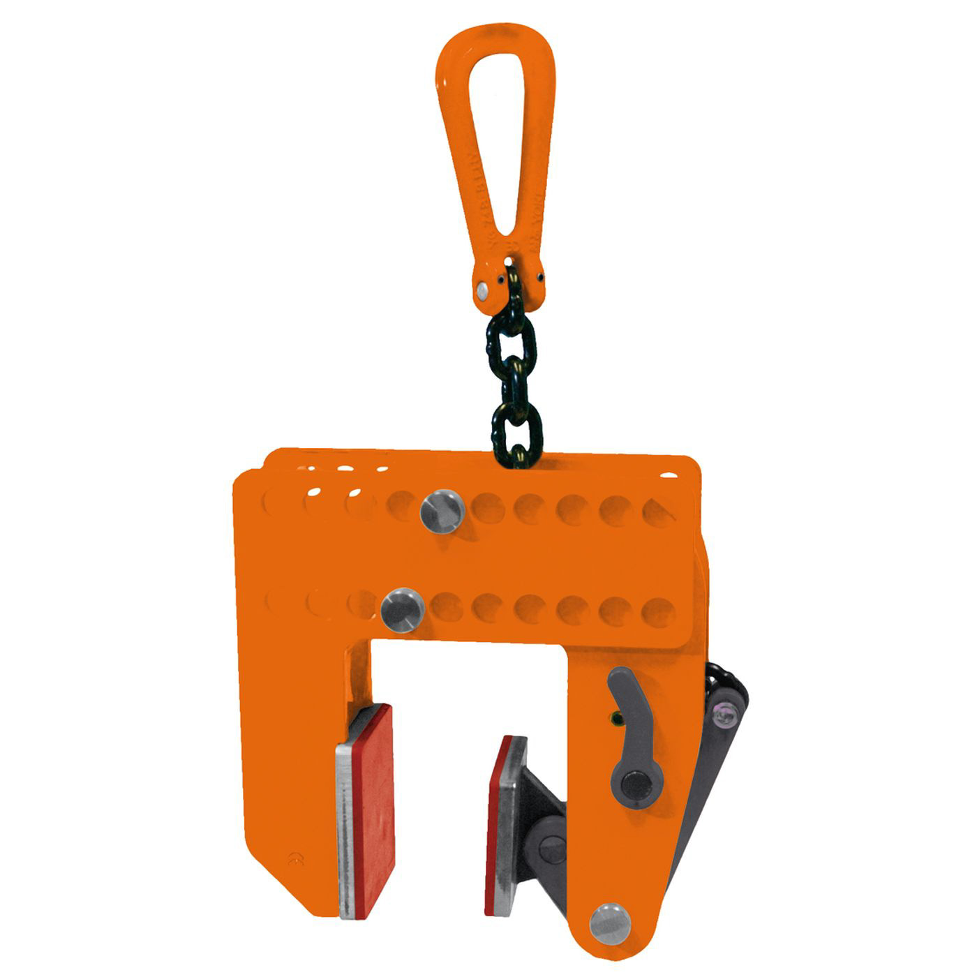 Die Klemmbacken dieser Spezialklemme sind mit einer Auflage aus Synthetikwerkstoff ausgestattet, welche bei der Anwendung keine Kerben auf dem Transportgut hinterlässt. Somit eignet sich die Klemme besonders für das Transportieren, Heben und Senken von Sondermaterialen wie z. B. rostfreien Stählen (Inox), Aluminiumblechen, Holz und Holzspanplatten. Zudem macht die Verstellbarkeit der Maulöffnungsweite, in Schritten von 20 mm, diese Klemme zu einem absoluten Allrounder.