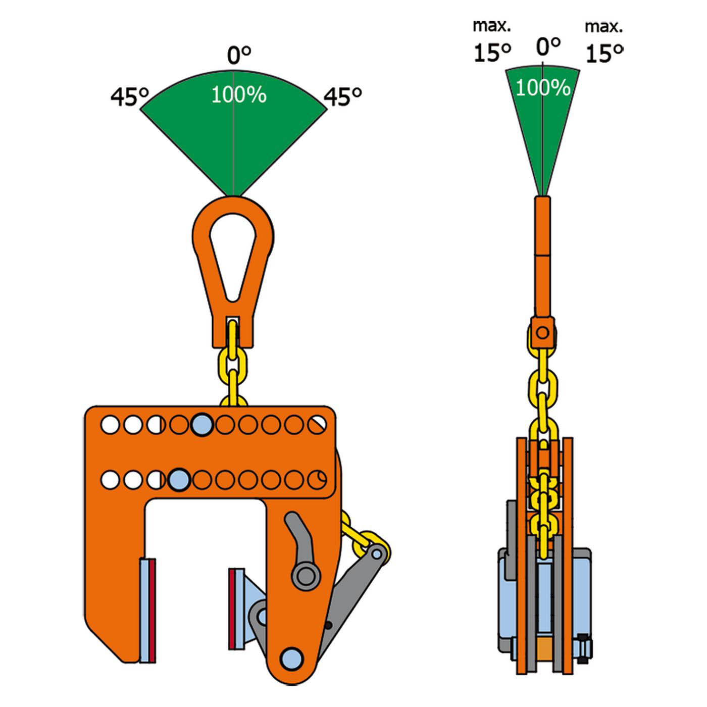 Die Klemme wird über eine hochfeste Kette mittels Aufhängering direkt in den Kranhaken eingehängt.
