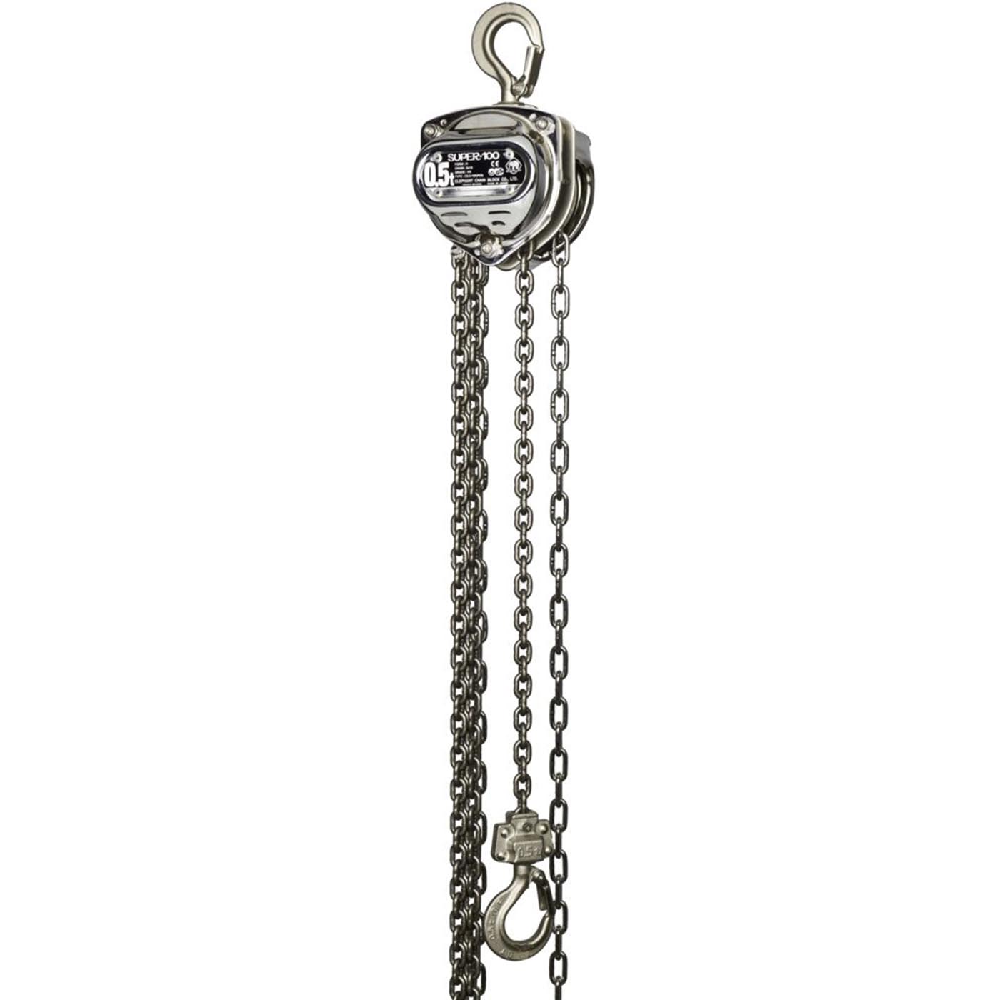 Mit Lastkette und Lasthaken in Edelstahlausführung, ideal für den Einsatz in der Lebensmittelindustrie.