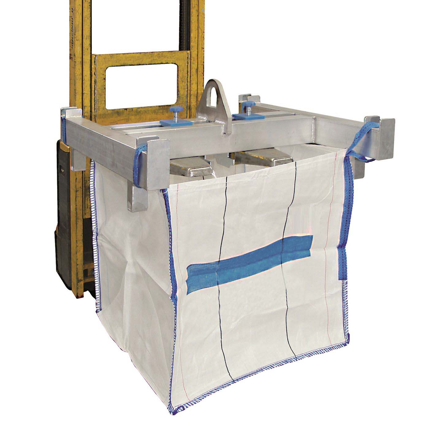 Diese Alu-Big-Bag-Traverse ist für den Kranbetrieb vorgesehen und hat zusätzlich Einfahrtaschen für Staplerzinken. Die Einfahrtaschen sind stufenlos auf die gewünschte Breite einverstellbar (maximales Gabelprofil von 240 x 115 mm).