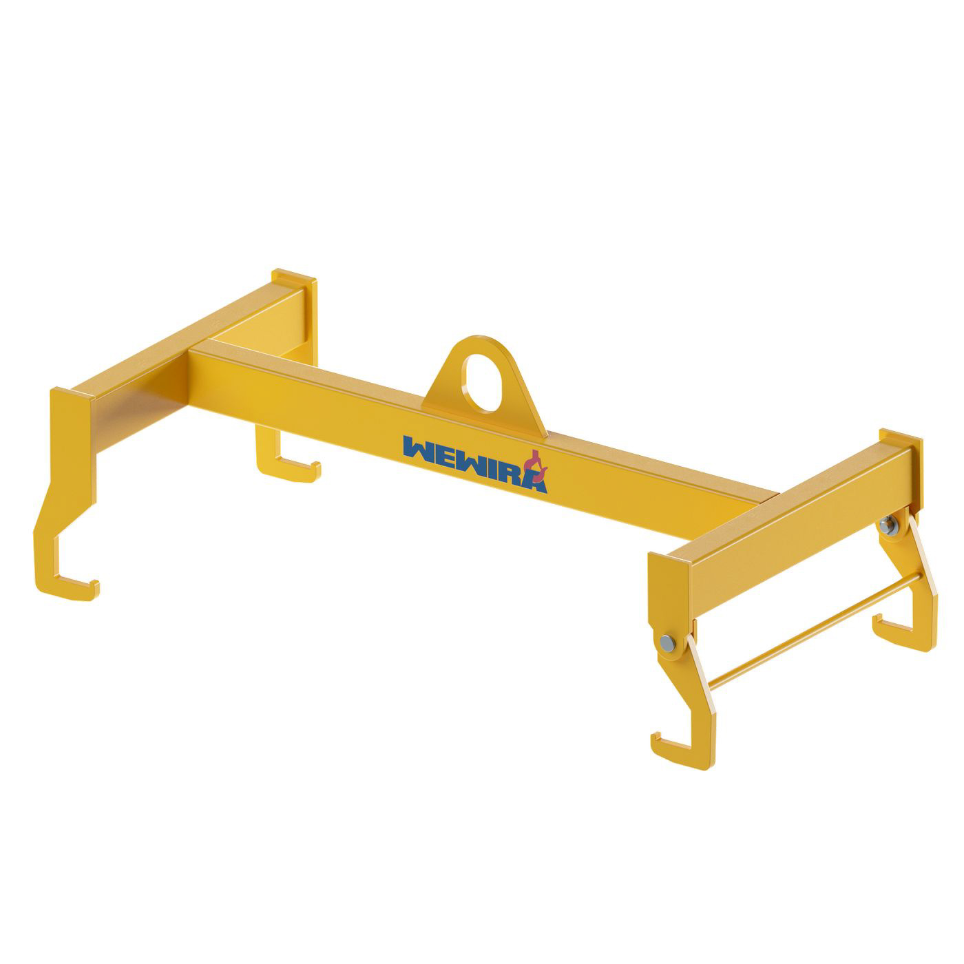 Durch diese Möglichkeit kann der Warentransport auch über die Krananlage erfolgen. Die Traverse ist ausgestattet mit zwei starren sowie zwei schwenkbaren Aufhängebügeln.