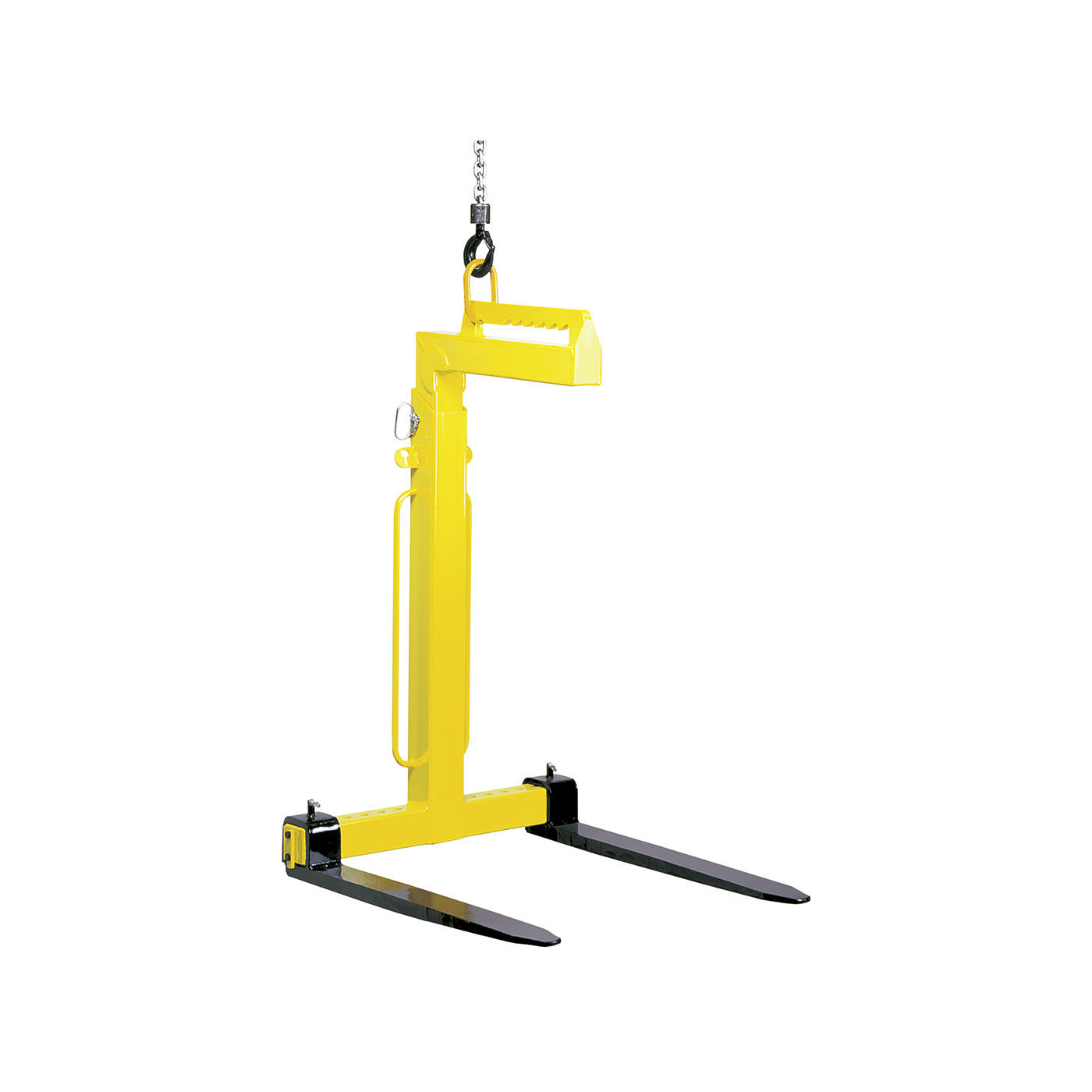 Diese Krangabeln sind mit verstellbaren Zinken und Höhenverstellung ausgestattet. Der Gewichtsausgleich erfolgt von Hand über eine Rasterverstellung der Aufhängeöse.