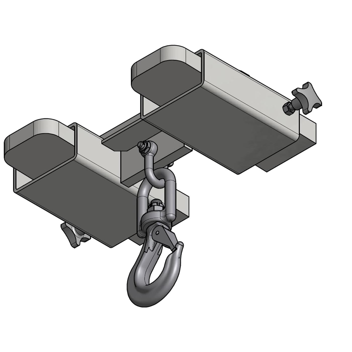 Klemmhebel zum Arretieren ausgestattet. Die Stapler-Traverse ist mit einem drehbaren Wirbelhaken ausgestattet.