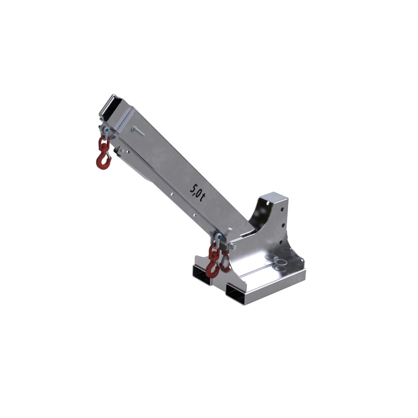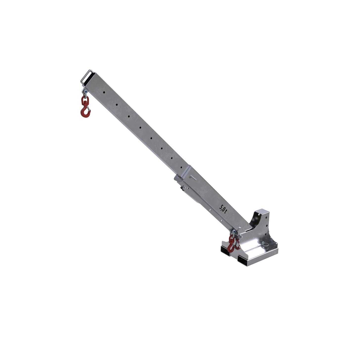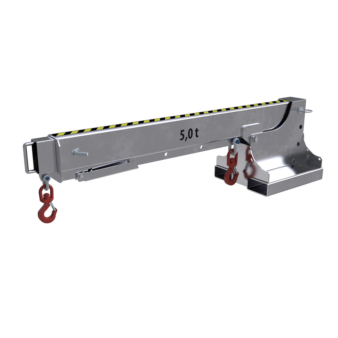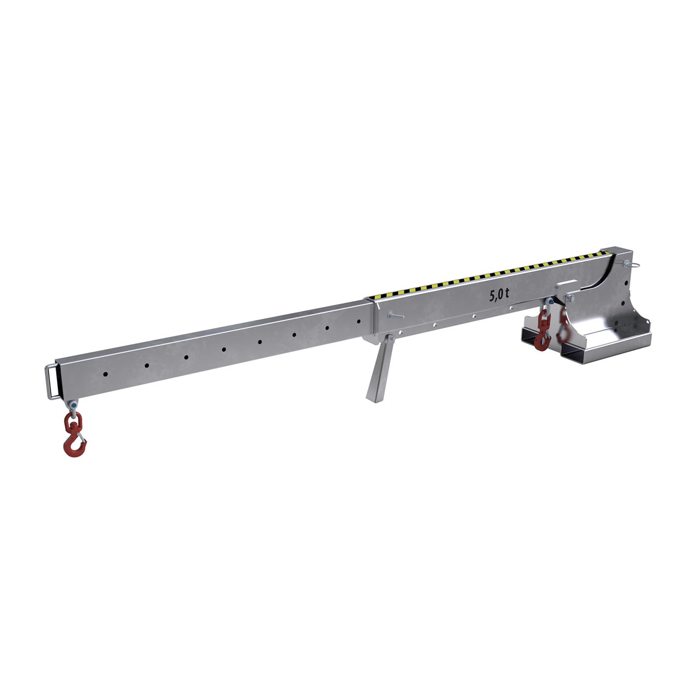 Der Teleskoplader vergrößert die Reichweite des Gabelstaplers. Er ist als Stahlkonstruktion gefertigt und mit einer Kettensicherung gegen unbeabsichtigtes Abrutschen gesichert.